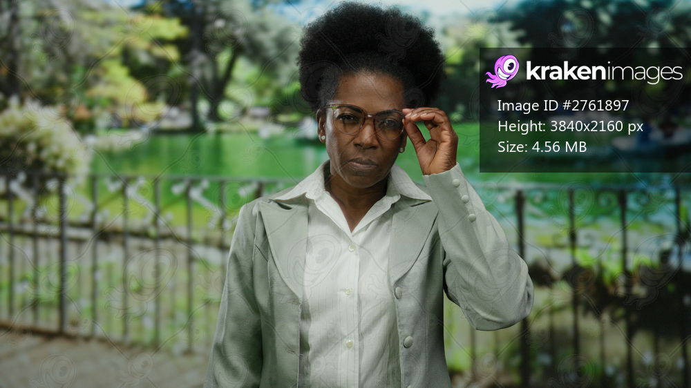 Woman with glasses standing outdoors in a park, wearing a suit, with a lake and lush trees in the background conveying a serene summer ambience.