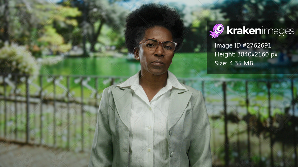 Woman with glasses standing outdoors in a park, wearing a suit, with a lake and lush trees in the background conveying a serene summer ambience.