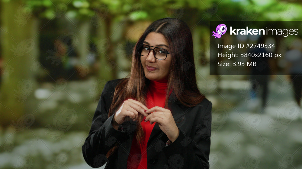 Woman with glasses stands on an outdoor street looking contemplative against a blurred background of trees and people in motion.