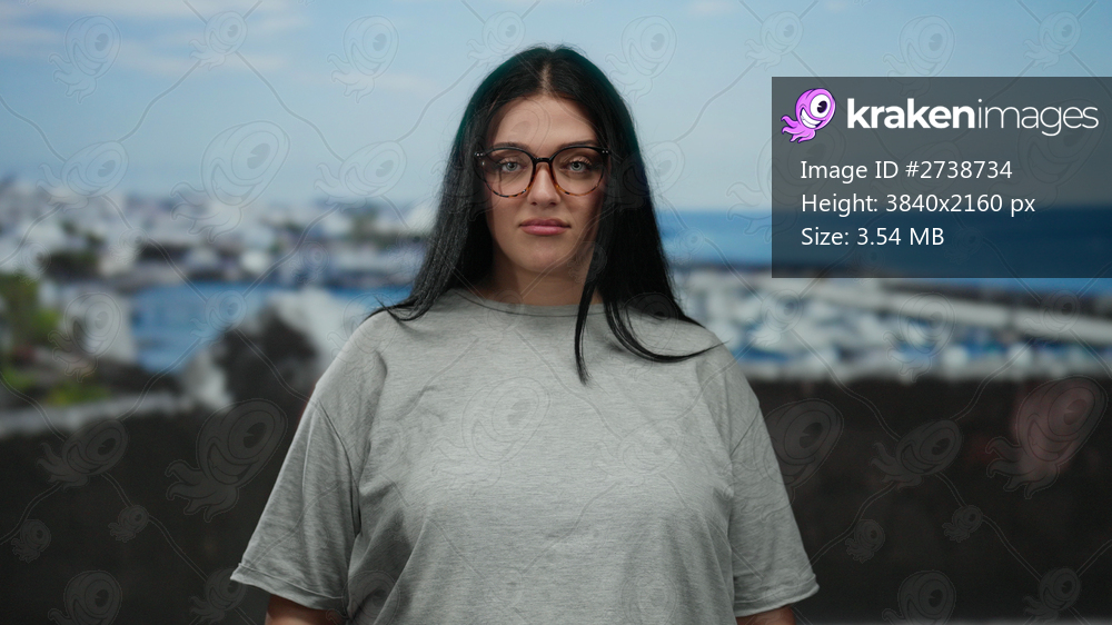 Woman with glasses stands outdoors near seaside port, embracing curvy fashion and beach scene with a relaxed demeanor in casual wear.