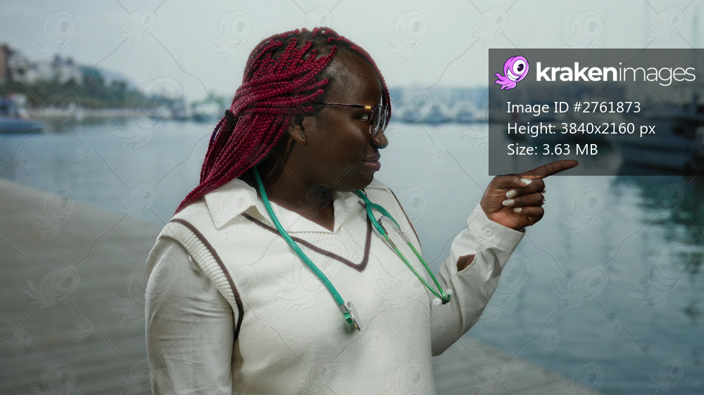 Woman with glasses and stethoscope stands at port pointing towards sea with boats visible in background under a clear sky.