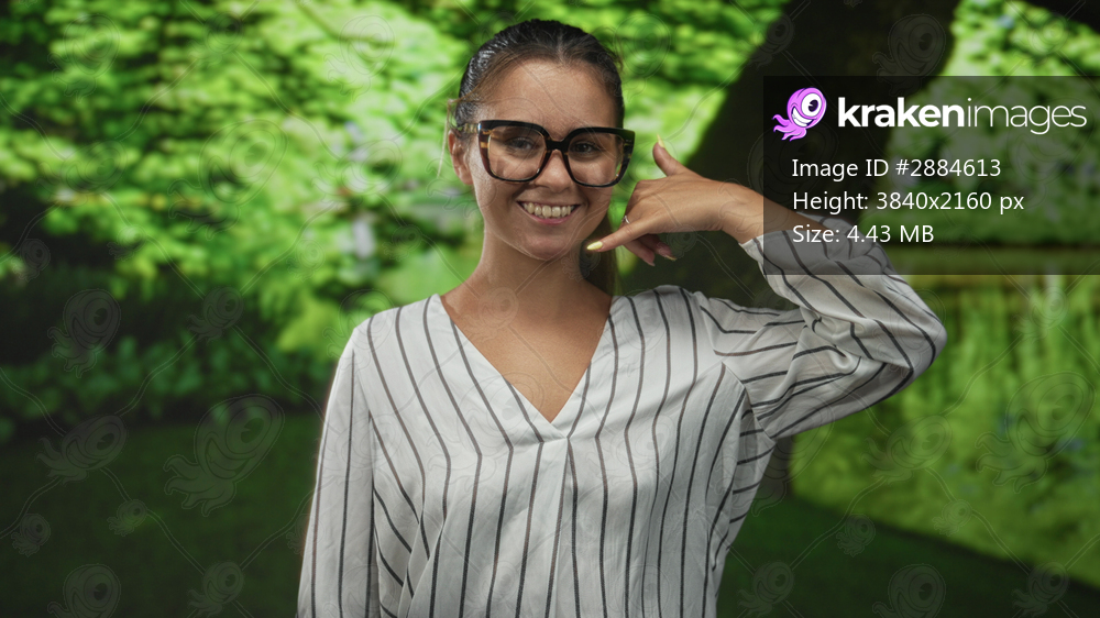 Woman with glasses and striped blouse smiling makes call gesture with hand to face in forest park setting; playful charm.