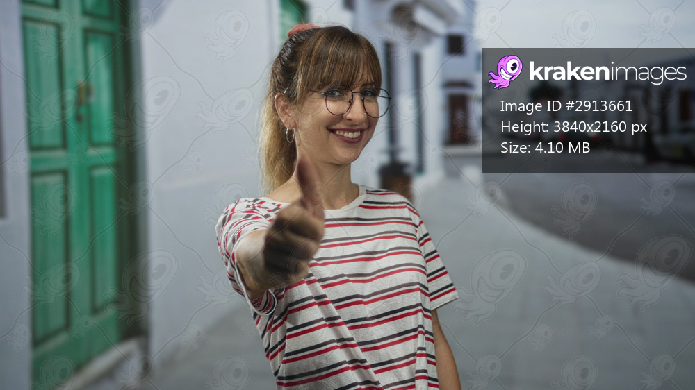 Woman with glasses and striped shirt pointing finger on a street near a green door and parked cars, hand raised showing watch and ponytail; playful confidence. - Kraken Images