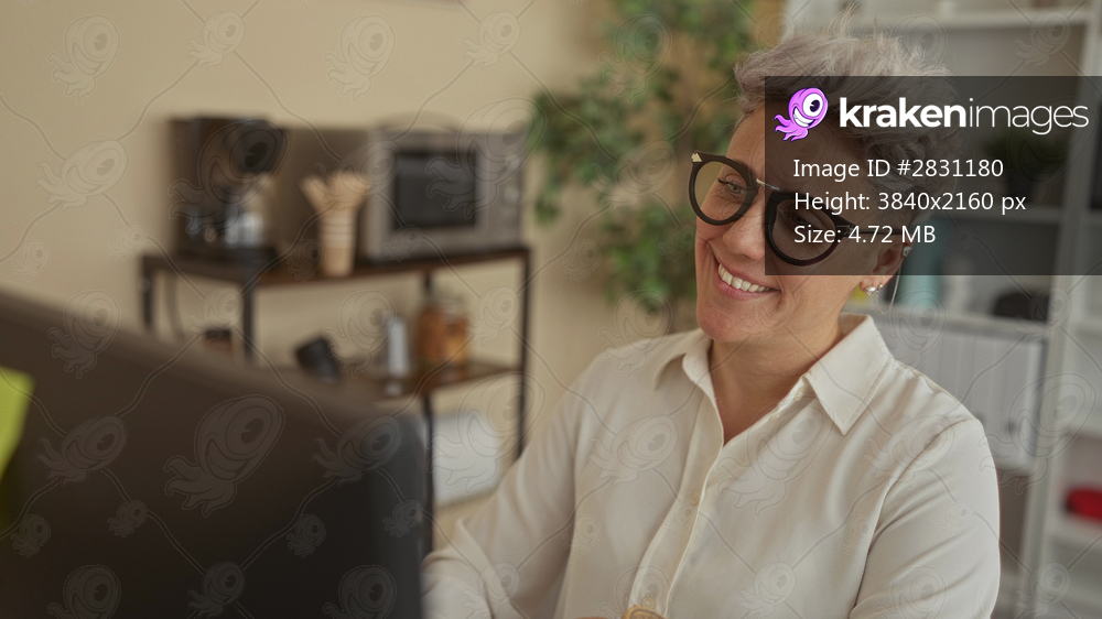 Woman with glasses tilting head while working at computer in office building; calm focus productivity.