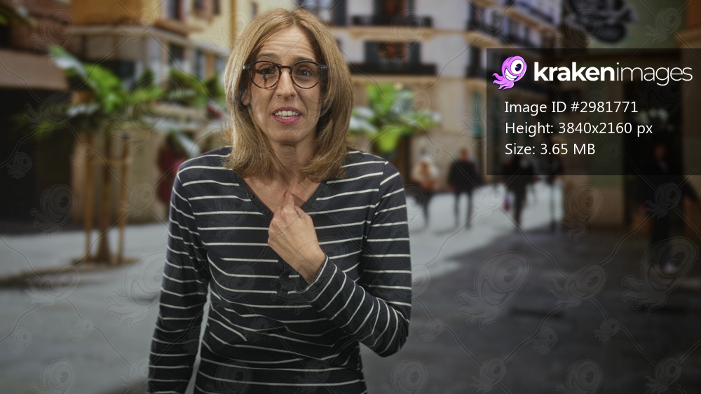 Woman with glasses touches chest while speaking and later waves on a busy street with shoppers; sincerity greeting.