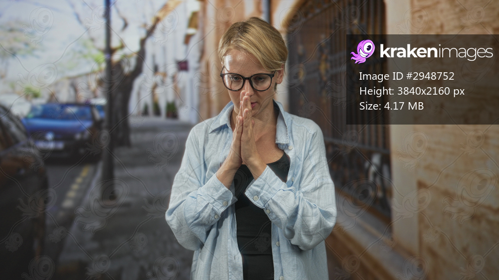 Woman with glasses touching chest and bringing palms together in a breathing exercise on a cobbled city street near iron gate and parked cars; mindfulness calm. - Kraken Images