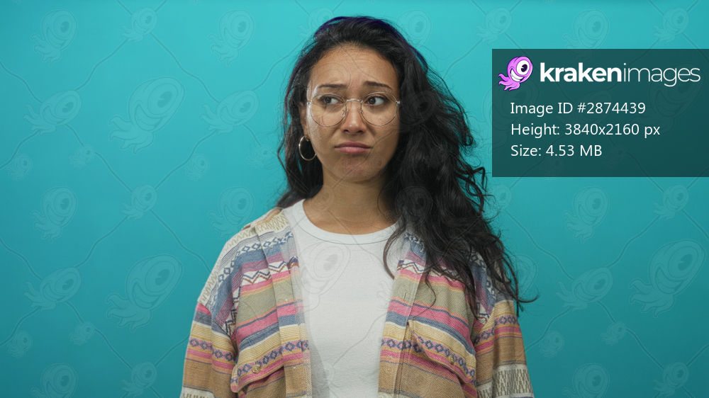 Woman with glasses touching forehead in studio teal backdrop with hand near mouth and hoop earring visible; concern.