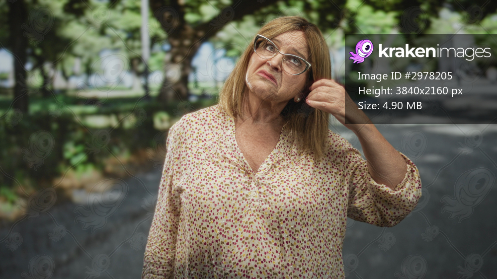Woman with glasses touching hair, hand raised and frowning while walking on street near trees and bench in a park; annoyance reflection.