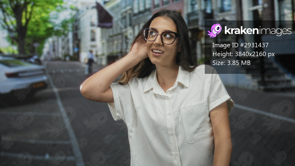 Woman with glasses touching her ear and smiling on a tree lined city street with parked cars and townhouses; curious ease.