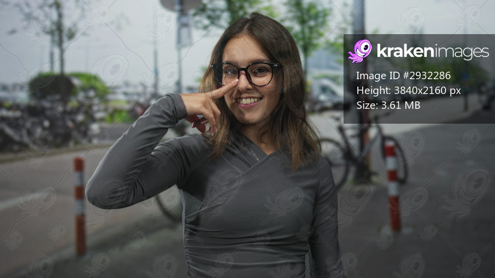 Woman with glasses touching her nose with finger on a city street near parked bicycles; playful charm.