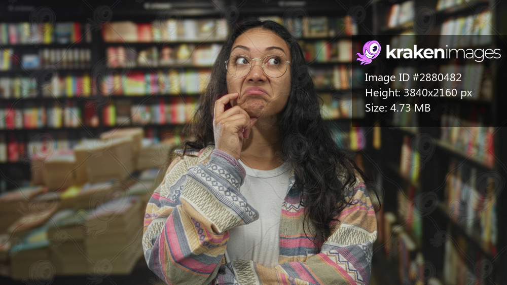 Woman with glasses touching temple and folding arm in library building among books and shelves; confusion curiosity.