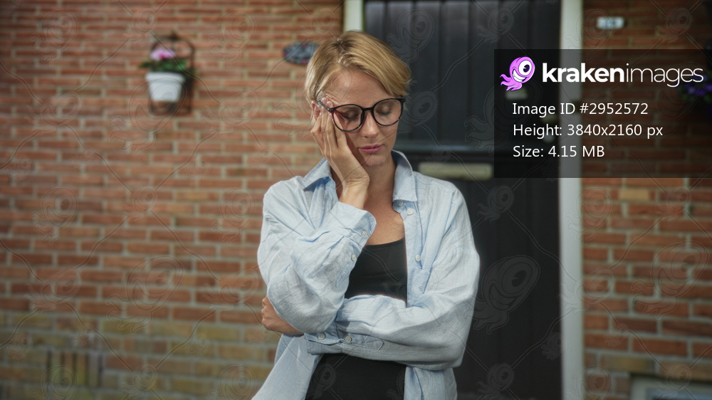 Woman with glasses touching temple with hand, arms crossed at residential building doorway for headache; fatigue reflection.