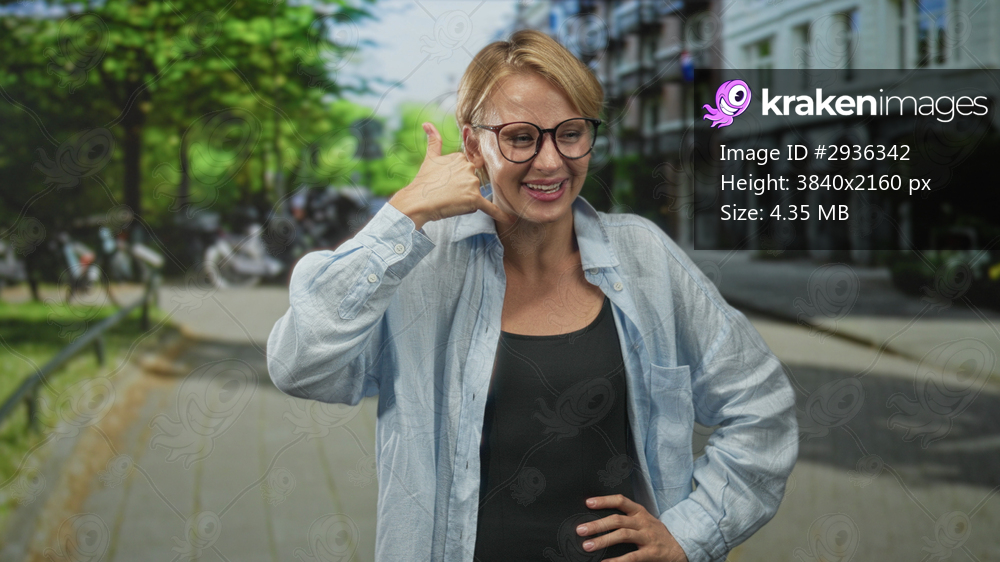 Woman with glasses using thumb to ear phone gesture on street with hand on hip; cheerful friendly connection.