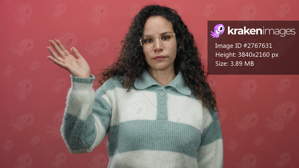 Woman with glasses waving over isolated pink background wearing a cozy striped sweater while expressing various emotions and posing casually for the camera - Kraken Images