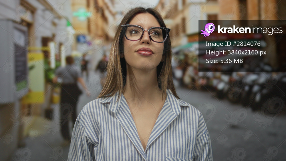 Woman with glasses wearing a striped shirt looking up on a busy street lined with scooters and cafes; serenity.