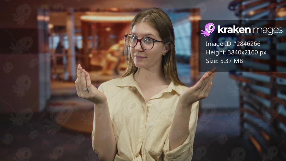 Woman with glasses wearing beige shirt holds hands in meditation gesture in building interior; mindful serenity.