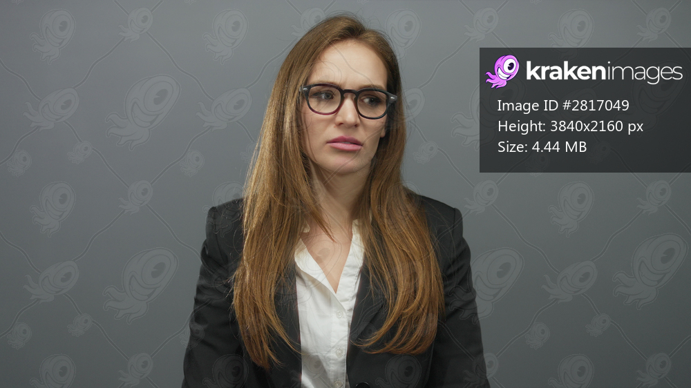 Woman with glasses wearing black blazer and white shirt talking with open mouth against gray studio background; confusion.