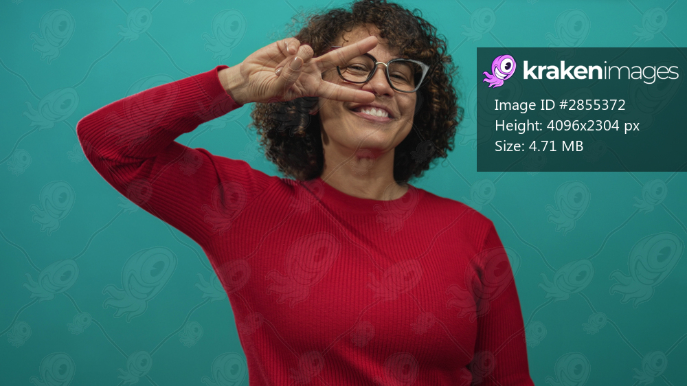 Woman with glasses wearing bright red sweater makes peace sign with right hand in studio portrait; joy.