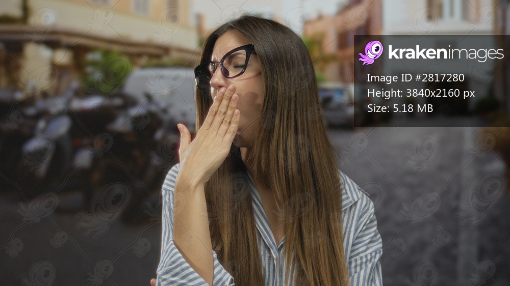 Woman with glasses wearing striped shirt covers mouth with hand on sunlit city street in midmorning rush; sleepiness.