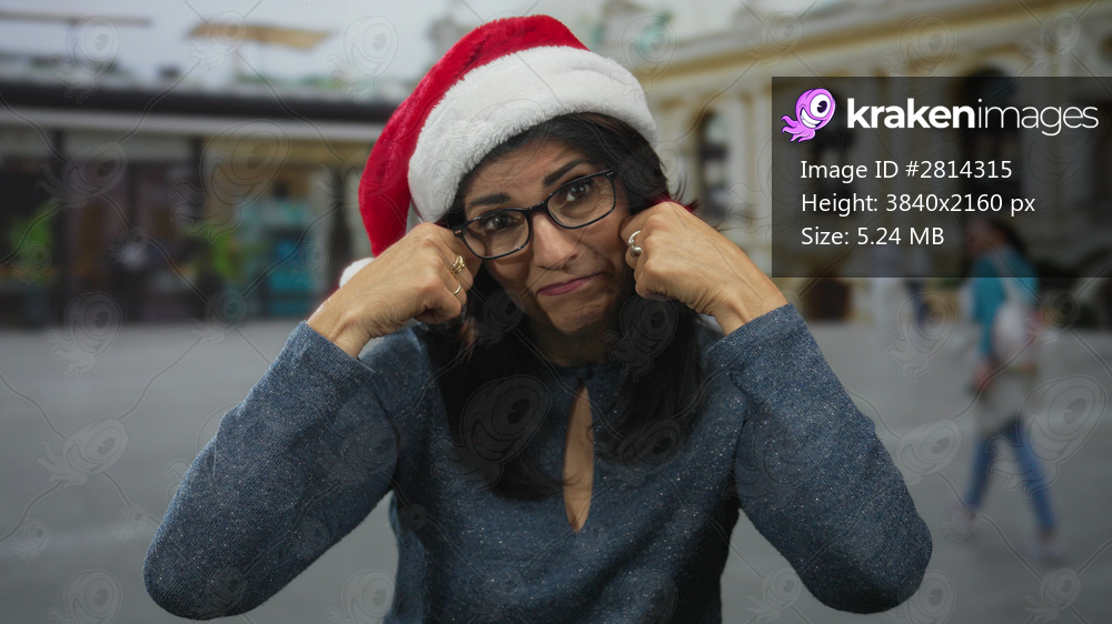 Woman with glasses wears red santa hat and pushes fists to cheeks in front of an urban building; holiday nostalgia sadness regret.