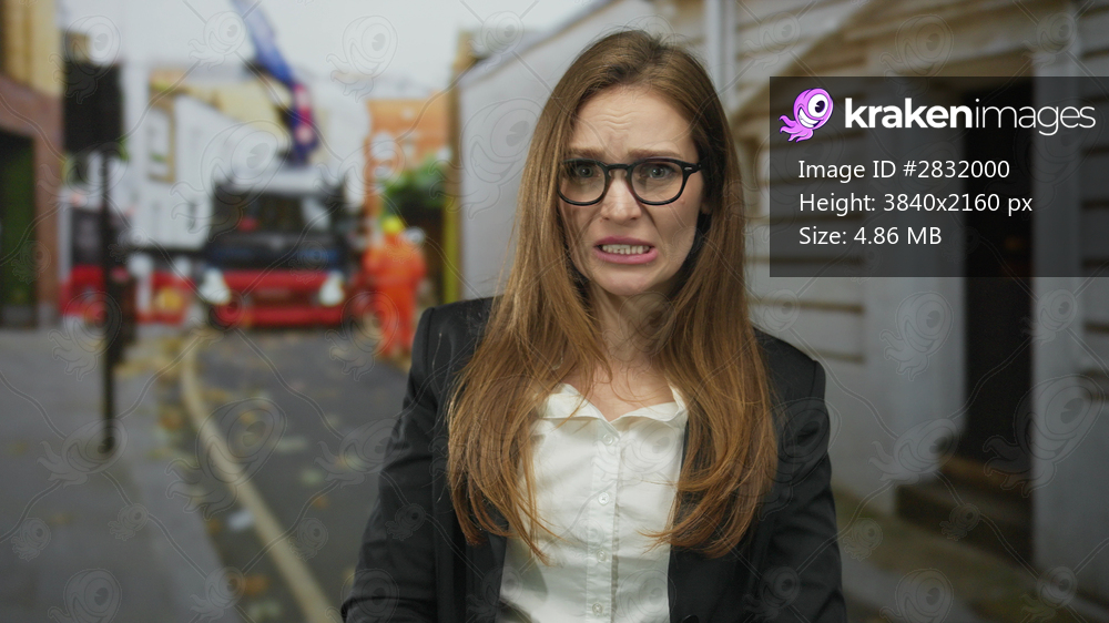Woman with glasses and white shirt grimaces on street with furrowed brows and bared teeth; anxiety tension.
