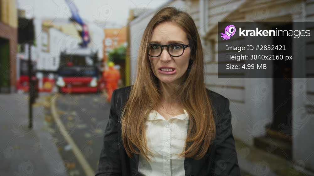Woman with glasses and white shirt grimaces on street with furrowed brows and bared teeth; anxiety tension.