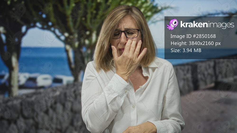 Woman with glasses and white shirt holds cheek for toothache at a street by the sea wall in bright daylight; discomfort.