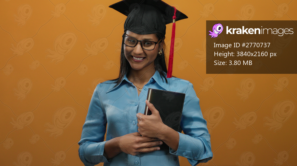 Woman graduate smiling, wearing graduation cap, holding book against vibrant orange background, embodying academic success and happiness.