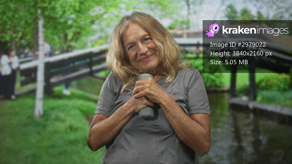Woman grasping a dumbbell with clasped hands at chest, smiling beside a wooden bridge over a canal in street; gentle fitness contentment.