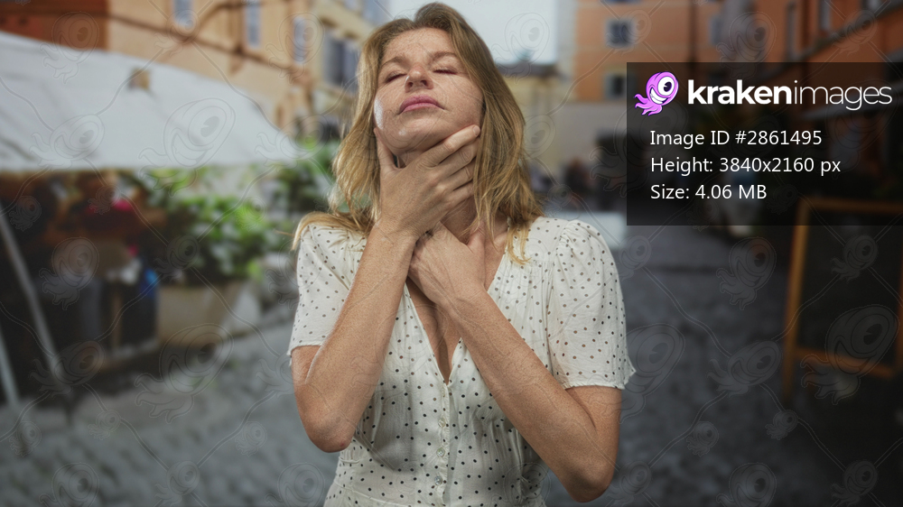 Woman grasping neck with both hands on street, head tilted back and eyes closed in gasping pose; panic choking.