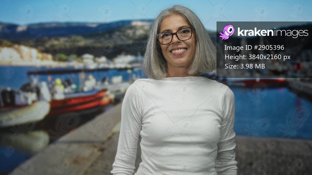Woman with gray hair and glasses in a white shirt turns head looking at boats on a port dock; serenity reflection.