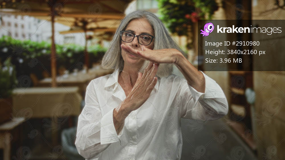 Woman with gray hair and glasses making time out hand gesture on restaurant terrace outdoors, white shirt with open collar, hands raised; boundary concern. - Kraken Images