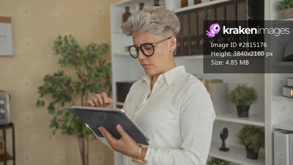 Woman with gray hair in white blouse holding tablet and stylus touches chin in building; concentration.