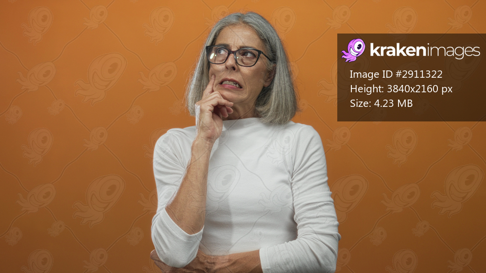 Woman gray haired wearing glasses and white long sleeve top touches chin with hand on cheek gesture in studio with orange backdrop; thoughtful reflection. - Kraken Images