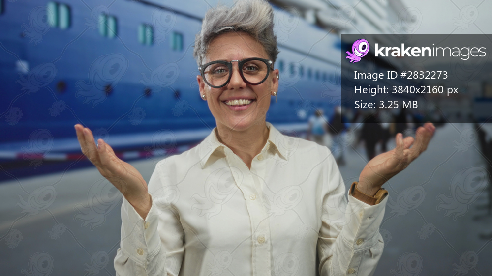 Woman with gray short hair and glasses shading eyes with both hands by boat on street; exploration wonder.