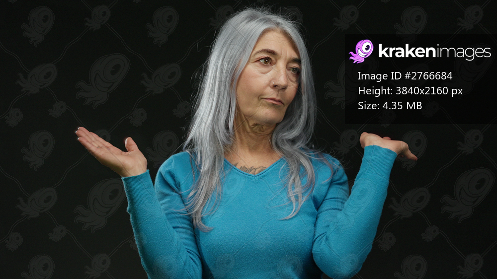 Woman with grey hair and blue sweater shrugs with both hands raised against a dark isolated background in a contemplative pose suggesting confusion.