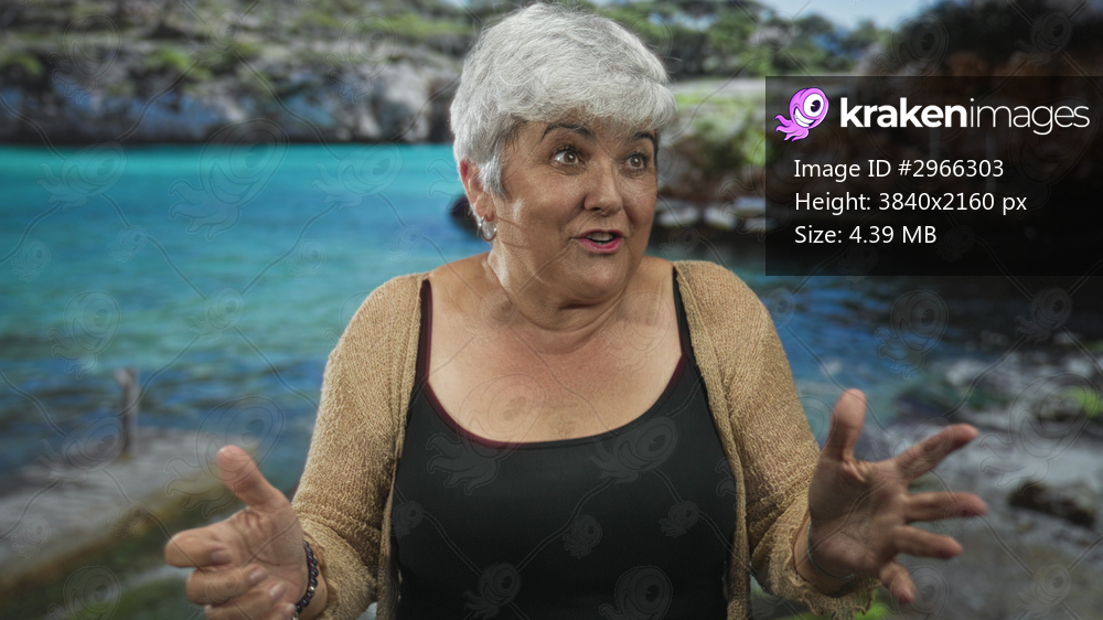 Woman with grey hair and cardigan, hands raised in animated gesture, smiling in black tank top at a rocky coastal cove pier; joy celebration.