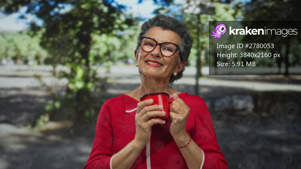 Woman with grey hair enjoying coffee in a park, surrounded by green trees and plants, wearing red clothing and glasses, holding a red cup with a serene expression. - Kraken Images