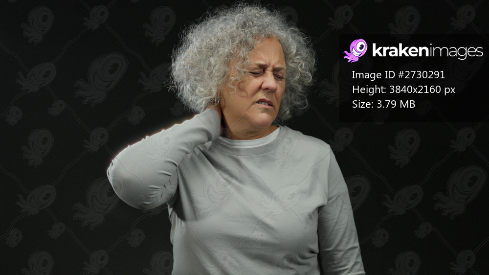 Woman with grey hair experiencing neck pain against a dark background, conveying discomfort and stress in isolation.