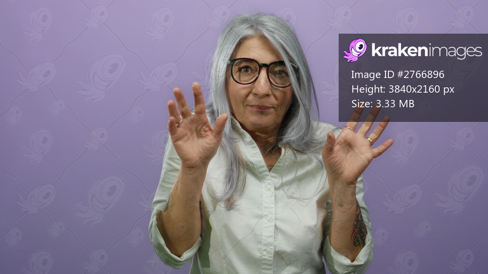 Woman with grey hair expressing surprise isolated against a purple background, wearing glasses and white shirt, conveying senior emotions in an isolated studio environment. - Kraken Images