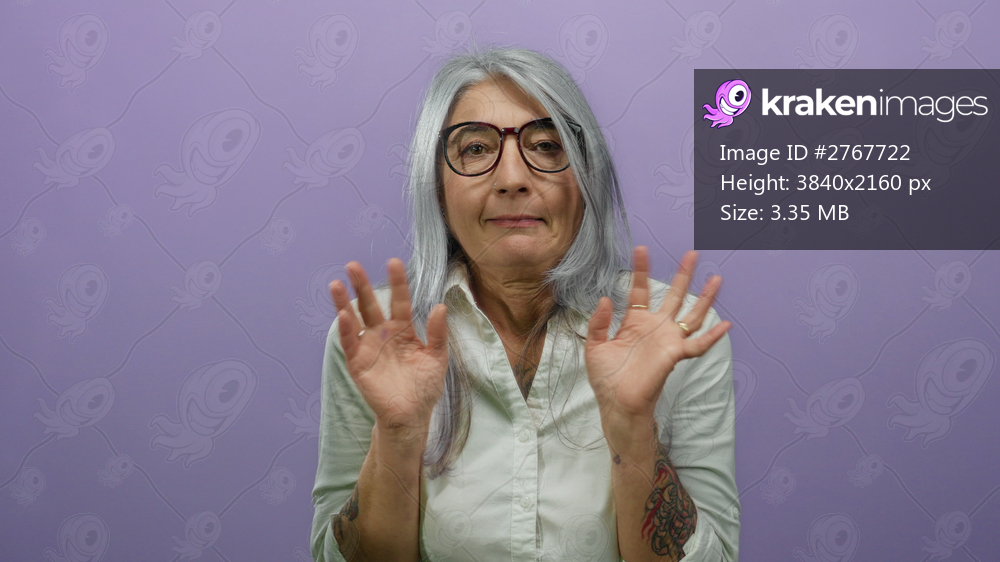 Woman with grey hair expressing surprise isolated against a purple background, wearing glasses and white shirt, conveying senior emotions in an isolated studio environment. - Kraken Images