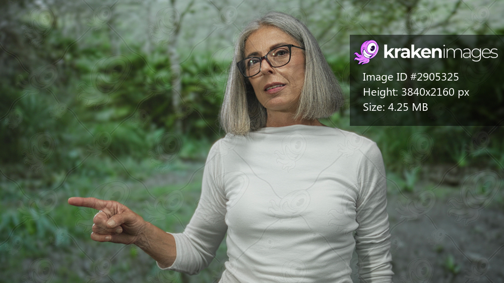 Woman with grey hair finger pointing upward in forest park outdoors wearing glasses and white shirt; serenity wisdom.