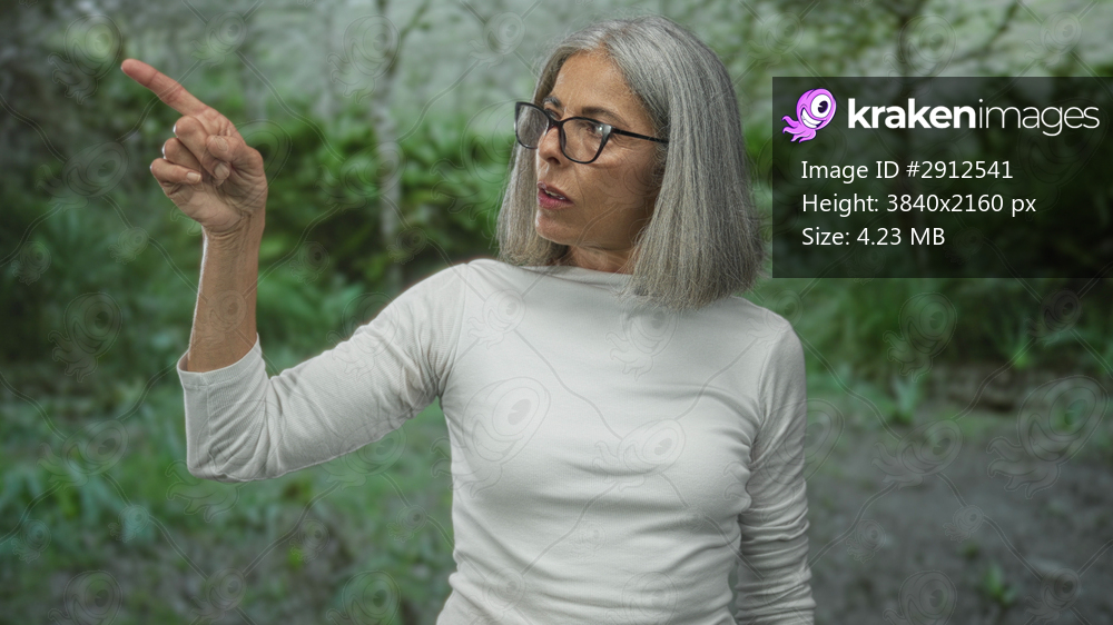 Woman with grey hair finger pointing upward in forest park outdoors wearing glasses and white shirt; serenity wisdom.
