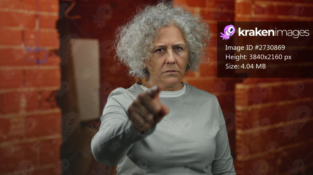 Woman with grey hair gestures at a construction site, showcasing emotions with hand gestures in a partially built home.