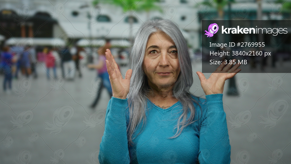 Woman with grey hair gestures expressively outdoors on a busy city street, surrounded by people, showcasing emotion and vibrancy in an urban environment. - Kraken Images
