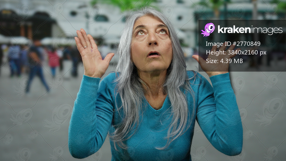 Woman with grey hair gestures expressively outdoors on a busy city street, surrounded by people, showcasing emotion and vibrancy in an urban environment. - Kraken Images