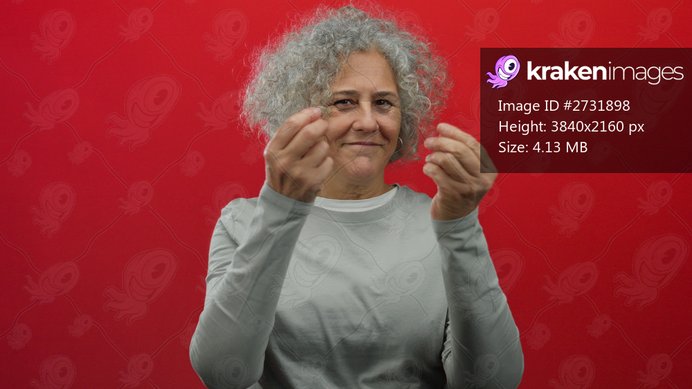 Woman with grey hair gesturing on a vivid red background, expressive and confident, capturing elegance and maturity in a simple pose, isolated from distractions. - Kraken Images