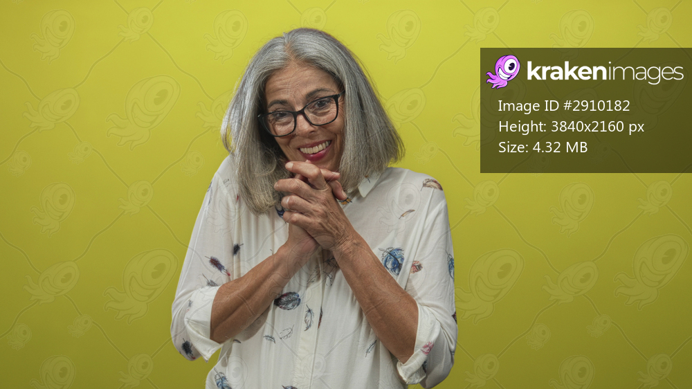 Woman with grey hair and glasses clapping hands in yellow studio, middle aged wearing a patterned white shirt and warm smile; joyful.