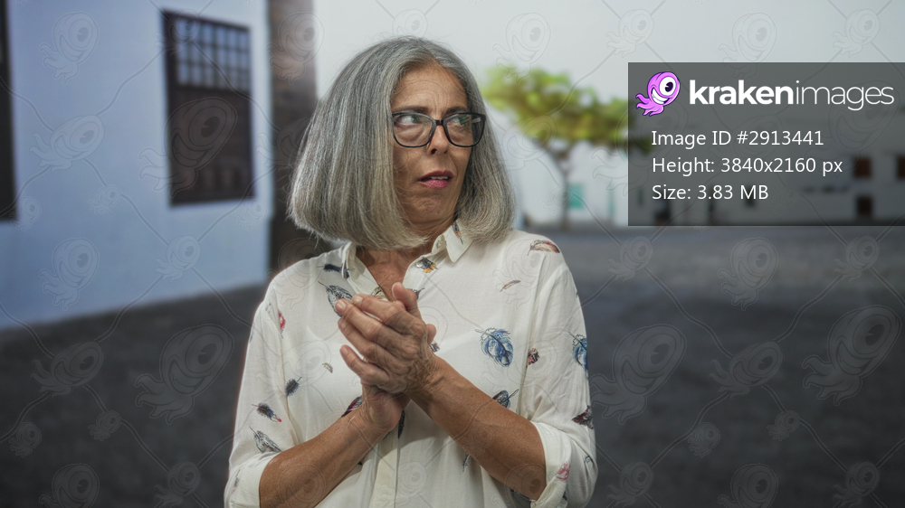 Woman with grey hair and glasses clasping hands in a sunlit street beside white buildings and a small tree, wearing a feather print blouse, hands central; quiet contemplation. - Kraken Images