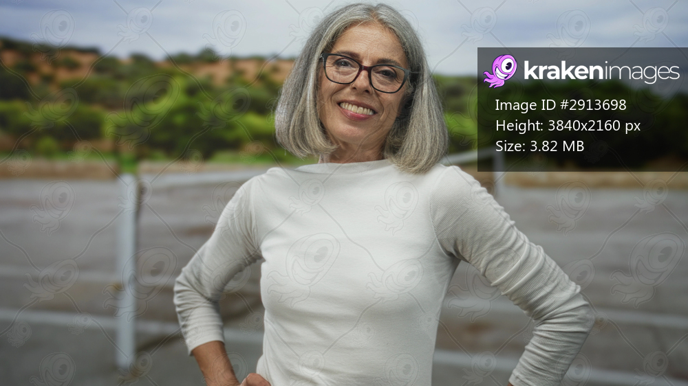 Woman with grey hair and glasses, face smiling and hands on hips at a street tennis court wearing a light top; confidence wellbeing.